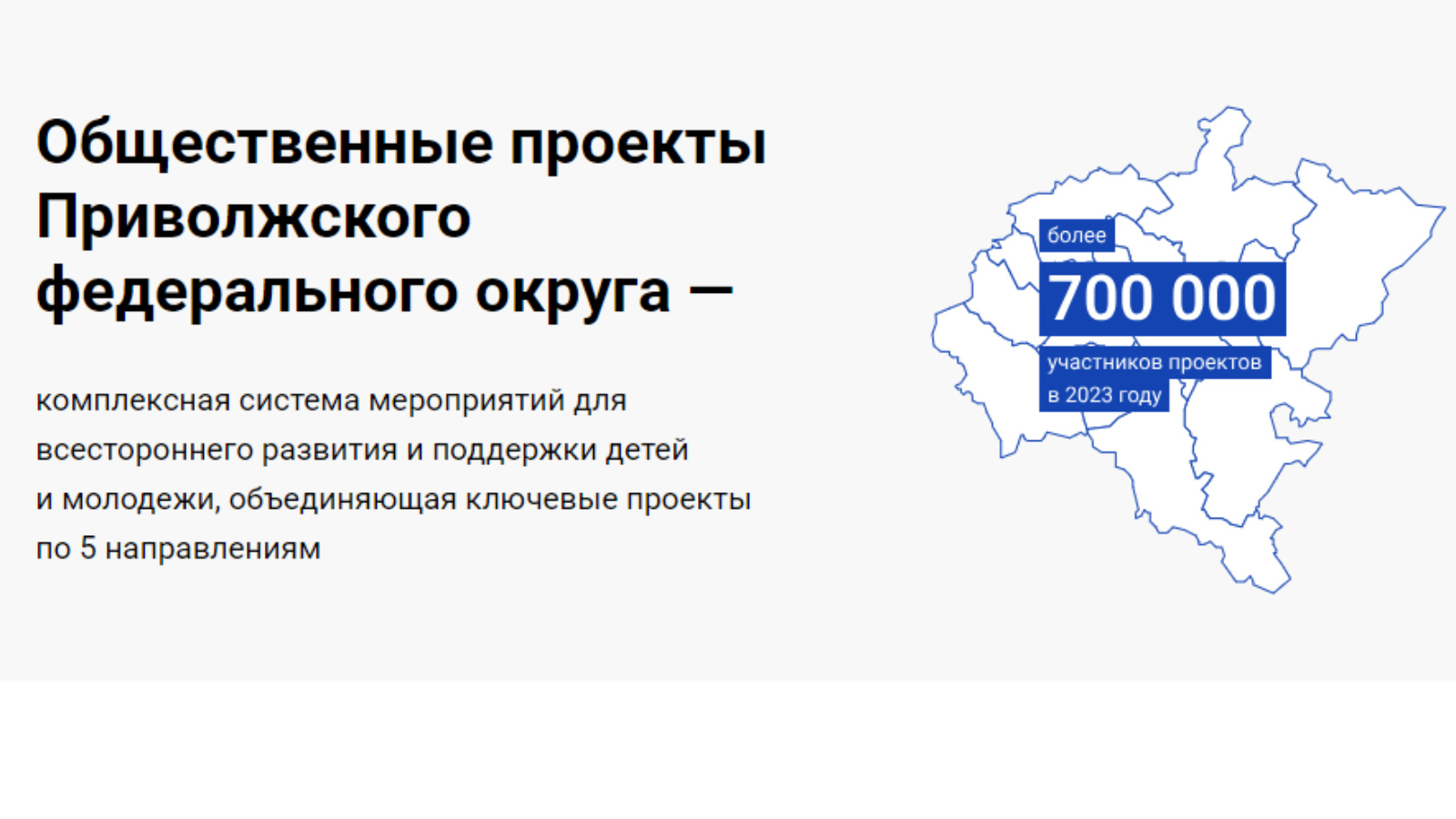 Общественные проекты Приволжского федерального округа — комплексная система мероприятий для всестороннего развития и поддержки детей и молодежи, объединяющая ключевые проекты по 5 направлениям: